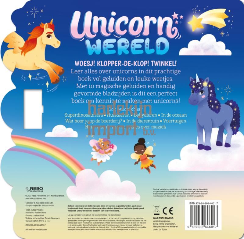 Woesj! Klopper-de-klop! Twinkel! Leer alles over unicorns in dit prachtige boek vol geluiden en leuke weetjes. Met 10 magische geluiden en handig gevormde bladzijden is dit een perfect boek om kennis te maken met unicorns!