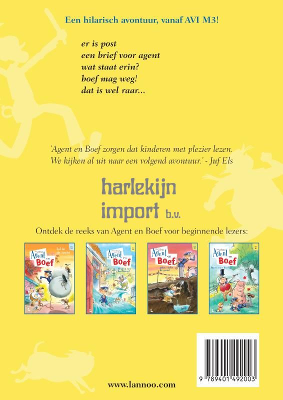 Een hilarisch avontuur, vanaf AVI M3! er is post een brief voor agent wat staat erin? boef mag weg! dat is wel raar... ‘Agent en Boef zorgen dat kinderen met plezier lezen. We kijken al uit naar een volgend avontuur.’ - Juf Els