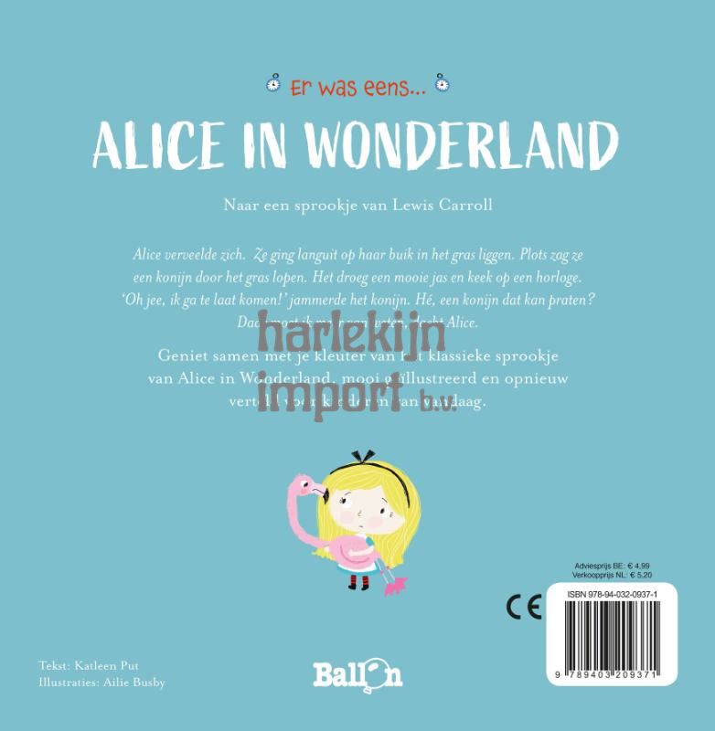 Alice verveelde zich. Ze ging languit op haar buik in het gras liggen. Plots zag ze een konijn door het gras lopen. Het droeg een mooie jas en keek op een horloge. ‘Oh jee, ik ga te laat komen!’ jammerde het konijn. Hé, een konijn dat kan praten? Daar moet ik meer van weten, dacht Alice. Geniet samen met je kleuter van het klassieke sprookje van Alice in Wonderland, mooi geïllustreerd en opnieuw verteld voor kinderen van vandaag. De perfecte eerste kennismaking met tijdloze verhalen.
