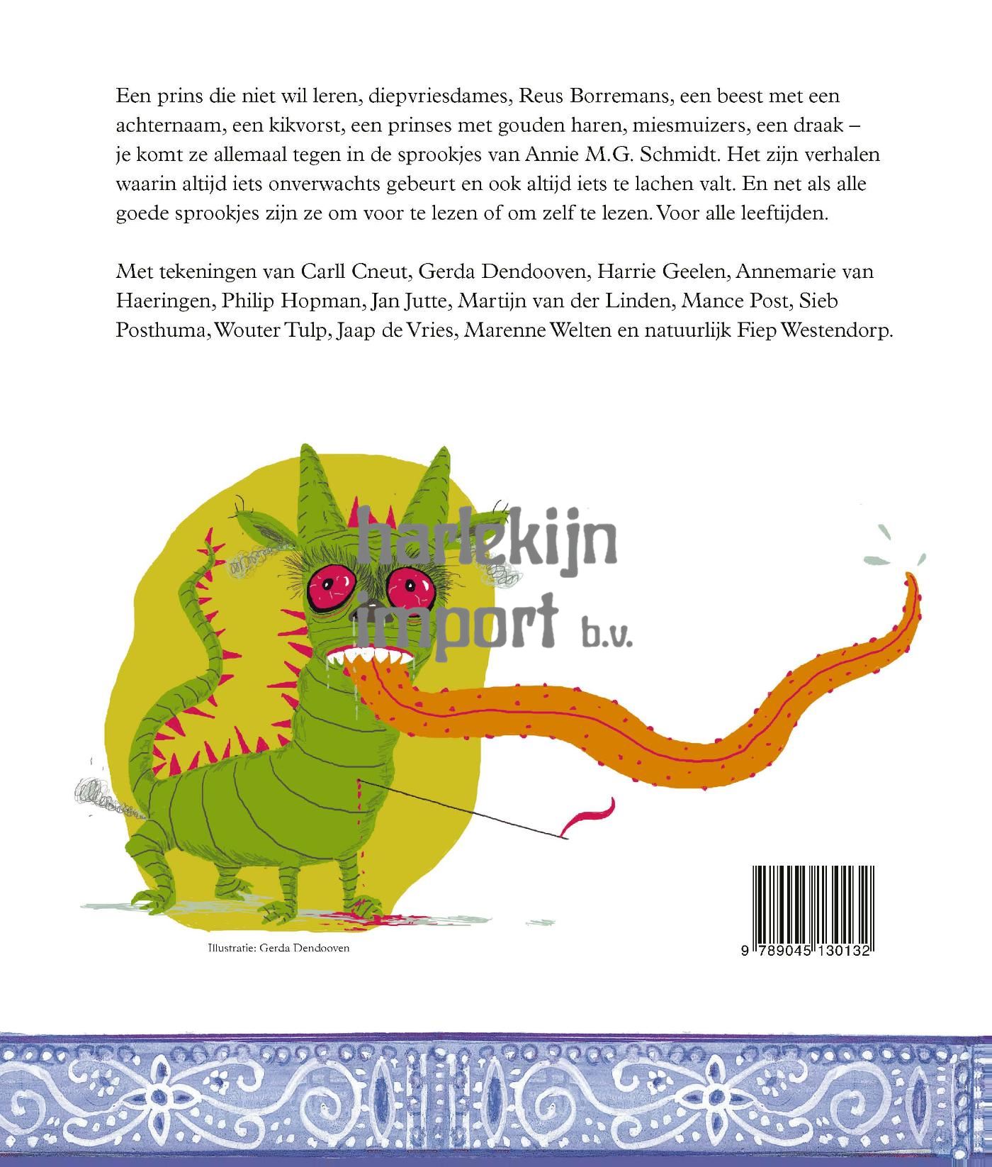 Een prins die niet wil leren, diepvriesdames, een kikvorst, een beest met een achternaam, Reus Borremans, een prinses met gouden haren, miesmuizers, een weerwolf – je komt ze allemaal tegen in de sprookjes van Annie M.G. Schmidt. Het zijn verhalen waarin altijd iets onverwachts gebeurt en ook altijd iets te lachen valt. En net als alle goede sprookjes zijn ze om voor te lezen of om zelf te lezen. Voor alle leeftijden. Met tekeningen van Carll Cneut, Gerda Dendooven, Harrie Geelen, Annemarie van Haeringen, Philip Hopman, Jan Jutte, Martijn van der Linden, Mance Post, Sieb Posthuma, Wouter Tulp, Jaap de Vries, Marenne Welten en natuurlijk Fiep Westendorp.