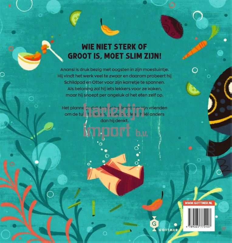 ‘Anansi de spin – een koekje van eigen deeg’ is alweer het derde deel in de serie mooie prentenboeken over de slimme spin Anansi. De prentenboeken zijn gebaseerd op de klassieke verhalen uit West-Afrika, Suriname en de Caraïben, die inmiddels over de hele wereld bekend zijn. Met de Anansi-boeken nemen Iven Cudogham en Moldybyrd Studio de geliefde fabels over de spin Anansi als uitgangspunt en maken er een modern, kleurrijk feestje van. In dit boek probeert Anansi weer een slim plannetje te bedenken. Maar ondanks al zijn sluwe ideetjes pakken zijn plannen niet altijd uit zoals hij wil. Anansi is aan het oogsten in zijn tuintje. Hij vindt het werk veel te zwaar en daarom probeert hij Schildpad en Otter voor zijn karretje te spannen. Maar die kennen Anansi langer dan vandaag!