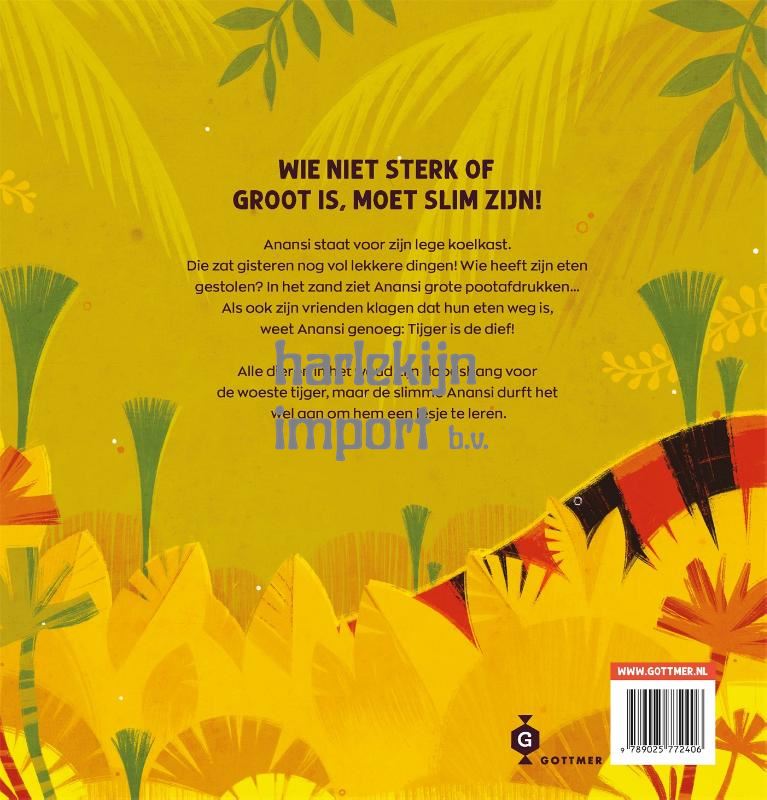 Een nieuwe serie over de ondeugende spin uit de West-Afrikaanse, Surinaamse en Caribische volksverhalen. Als Anansi de spin zijn leeggeplunderde koelkast en de grote pootafdruk voor zijn deur ziet, weet hij al hoe laat het is: Tijger is weer langs geweest en heeft zich tegoed gedaan aan al het lekkere eten van Anansi en zijn vrienden in het woud. Tijd om Tijger een lesje te leren! Alle dieren bibberen van angst voor Tijger, maar Anansi niet. Die schudt zo een sluw plannetje uit zijn mouw om Tijger op zijn plek te zetten.