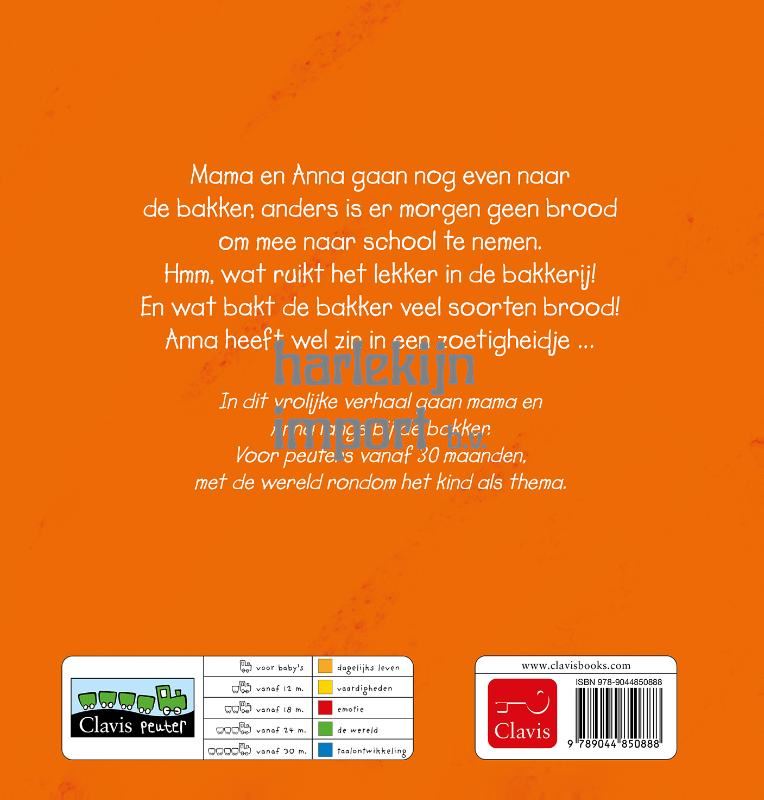 Mama en Anna gaan nog even naar de bakker, anders is er morgen geen brood om mee naar school te nemen. Hmm, wat ruikt het lekker in de bakkerij! En wat bakt de bakker veel soorten brood! Anna heeft wel zin in een zoetigheidje … In dit vrolijke verhaal gaan mama en Anna langs bij de bakker. Voor peuters vanaf 30 maanden, met de wereld rondom het kind als thema.