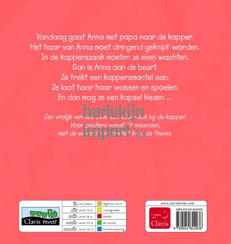 Een vrolijk verhaal over een afspraak bij de kapper. Voor peuters vanaf 24 maanden, met de wereld rondom het kind als thema. Vandaag gaat Anna met papa naar de kapper. Het haar van Anna moet dringend geknipt worden. In de kapperszaak moeten ze even wachten. Dan is Anna aan de beurt. Ze trekt een kappersmantel aan. Ze laat haar haar wassen en spoelen. En dan mag ze een kapsel kiezen …