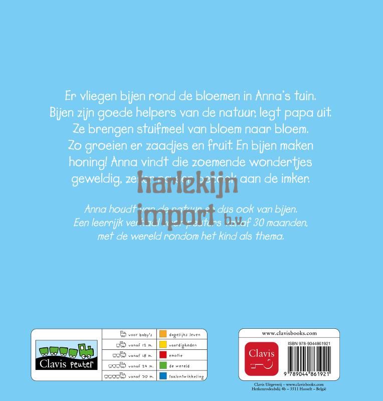 Er vliegen bijen rond de bloemen in Anna’s tuin. Bijen zijn goede helpers van de natuur, legt papa uit. Ze brengen stuifmeel van bloem naar bloem. Zo groeien er zaadjes en fruit. En bijen maken honing! Anna vindt die zoemende wondertjes geweldig, zeker na een bezoek aan de imker. Anna houdt van de natuur, en dus ook van bijen. Een leerrijk verhaal voor peuters vanaf 30 maanden, met de wereld rondom het kind als thema.
