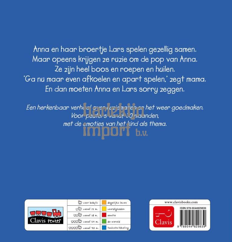 Anna en haar broertje Lars spelen gezellig samen. Maar opeens krijgen ze ruzie om de pop van Anna. Ze zijn heel boos en roepen en huilen. 'Ga nu maar even afkoelen en apart spelen,' zegt mama. En dan moeten Anna en Lars sorry zeggen.