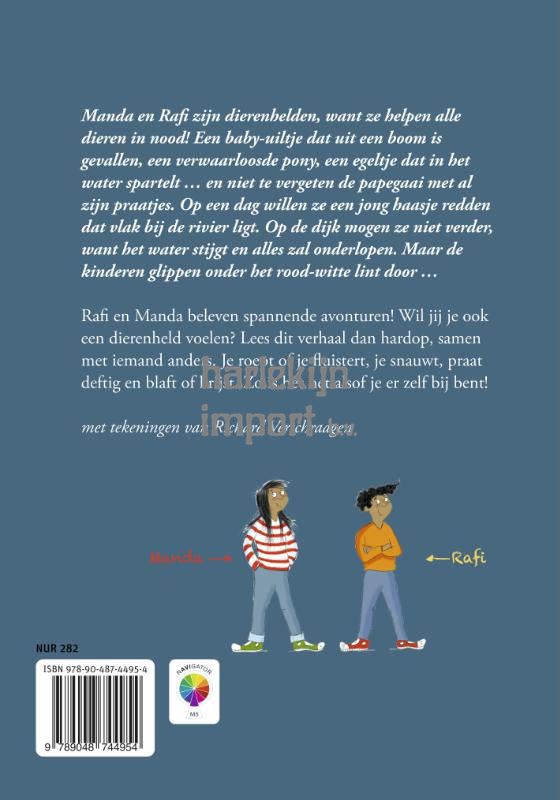 In dit spannende toneelleesboek op AVI M5 redden Manda en Rafi alle dieren in nood. Maar wat te doen als een babyhaasje te dicht bij de rivier ligt en het water stijgt? Rafi en Manda glippen toch stiekem onder het rood-witte lint door, maar of dat slim is?