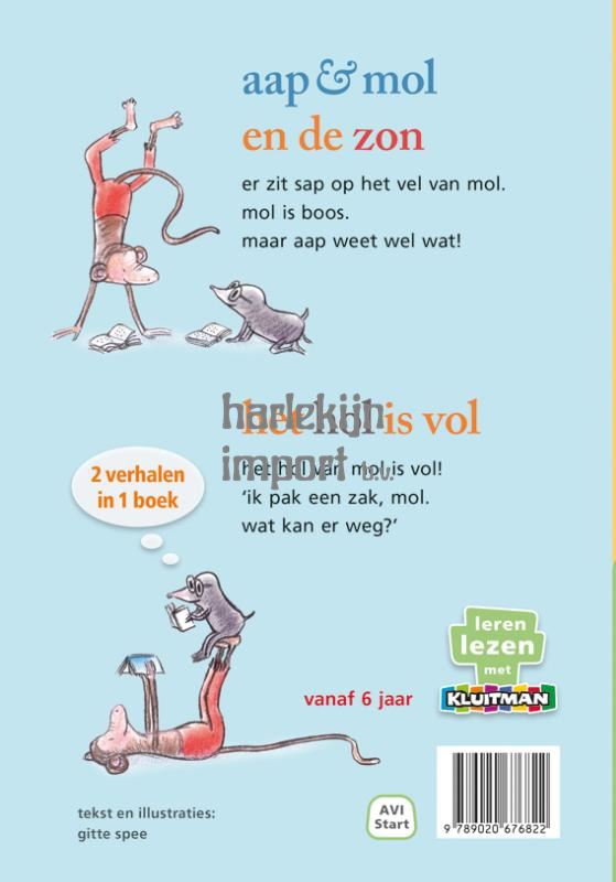 Een mooie bind-up in de populaire ‘aap & mol’-serie op AVI-startniveau. Deze 2-in-1-bundel bevat aap & mol en de zon en aap & mol. het hol is vol. Als geen ander weet Gitte Spee eenvoudige woorden te vinden om mooie, ontroerend lieve verhalen te vertellen, die ze zelf prachtig illustreert. In aap & mol en de zon maakt Aap Mol per ongeluk helemaal vies. Gelukkig heeft Aap een plan: ze gaan naar de zee. Daar leert Mol dat het toch wel leuk kan zijn om nieuwe dingen te proberen. In het hol is vol komt Aap op bezoek bij Mol. Het hol is echter zo rommelig dat Aap alles wil opruimen. Alleen wil Mol niets weggooien en dat zorgt voor problemen…