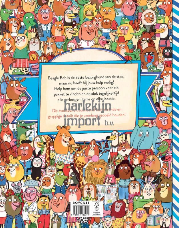 Bob de beagle is de beste bezorghond van de stad. Hij zorgt er namelijk altijd voor dat alle pakketjes op tijd aankomen. Van het ontbrekende T Rex-bot voor het dinosaurusmuseum tot een vervangende strijkstok voor de violist in het orkest. Maar Bob heeft nu jouw hulp nodig! Vind jij de juiste persoon voor elk pakketje? Een verhaal en zoekboek in één, dit unieke boek zit boordevol fascinerende en grappige details die zowel jong als oud urenlang geboeid bezig houden.