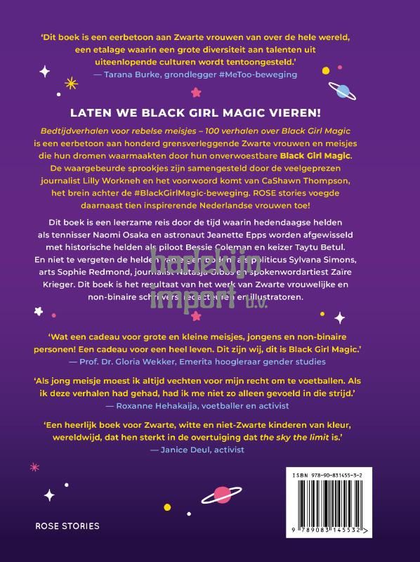 Bedtijdverhalen voor rebelse meisjes - 100 verhalen over Black Girl Magic is een eerbetoon aan 100 grensverleggende Zwarte vrouwen en meisjes die hun dromen waarmaakten door hun onverwoestbare Black Girl Magic. De waargebeurde sprookjes zijn samengesteld door de veelgeprezen journalist Lily Workneh en het voorwoord komt van CaShawn Thompson, het brein achter de #BlackGirlMagic-beweging. ROSE stories voegde daarnaast 10 inspirerende vrouwen toe! Dit boek is een leerzame reis door de tijd waarin hedendaagse helden als tennisser Naomi Osaka en astronaut Jeanettte Epps worden afgewisseld met historische helden als piloot Bessie Coleman en keizer Taytu Betul. En niet te vergeten de helden van eigen bodem als politicus Sylvana Simons, arts Sophie Redmond, journalist Natasja Gibbs en spokenwordartiest Zaïre Krieger. Dit boek is het resultaat van het werk van Zwarte vrouwelijke en non-binaire schrijvers, illustratoren en redacteuren.