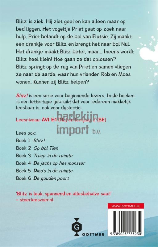 De AVI-boeken over het ruimtewezen Blitz van Rian Visser en Lars Deltrap zijn mateloos populair bij beginnende en dyslectische lezers. Ook in ‘Blitz 7 – Een gek drankje’ is een lettertype gebruikt dat voor iedereen makkelijk leesbaar is, om zelf te leren in een wereld vol raketten. Blitz is ziek. Hij ziet geel en kan alleen maar op bed liggen. Het vogeltje Priet wil hem beter maken en gaat op zoek naar hulp. Priet komt terecht op de bol van Flutsie, die een drankje voor Blitz maakt. Het drankje werkt, maar heeft ook een nare bijwerking: Blitz wordt niet alleen beter, maar ook heel klein! Hoe gaan ze dat oplossen? Naar Flutsie gaan durft Blitz niet. Hij springt op de rug van Priet en samen vliegen ze naar de aarde, waar Rob en Moes wonen. Zouden zij hem kunnen helpen?