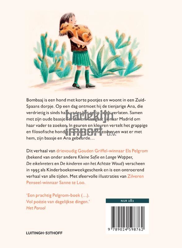 Els Pelgrom, drievoudige Gouden Griffel-winnaar, schreef in 1995 Bombaaj als Kinderboekenweekgeschenk. Voor het eerst is dit ontroerende verhaal leverbaar in een mooie verzorgde uitgave met fullcolourillustraties van Zilveren Penseel-winnaar Sanne te Loo. Bombaaj is een hond en woont samen met zijn oude baasje Serafin in een Spaans dorp. Op een dag komt de tienjarige Ana er wonen en verandert Bombaajs leven compleet. Het meisje is verdrietig sinds haar vader het gezin heeft verlaten. Serafin besluit Ana’s vader op te sporen en neemt Ana en Bombaaj mee op een lange autoreis naar Madrid. Het wordt een groots avontuur. ‘Het is een prachtig Pelgromboekje (…): vol poëzie van dagelijkse dingen.’ Het Parool