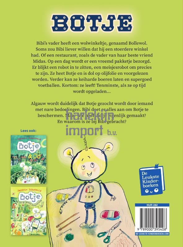 Vertederend verhaal over het liefste robotje ooit – nu in nieuwe editie! Bibi’s vader heeft een wolwinkeltje, genaamd Bollewol. Soms zou Bibi liever willen dat hij een stoerdere winkel had. Of een restaurant, zoals de vader van haar beste vriend Midas. Op een dag wordt er een vreemd pakketje bezorgd. Er blijkt een robot in te zitten, een meisjesrobot om precies te zijn. Ze heet Botje en is dol op olijfolie en voorgelezen worden. Verder kan ze keiharde boeren laten en supergoed voetballen. Kortom: ze leeft! Tenminste, als ze op tijd wordt opgeladen... Algauw wordt duidelijk dat Botje gezocht wordt door iemand met nare bedoelingen. Bibi doet er alles aan om Botje te beschermen. Maar wie heeft Botje eigenlijk gemaakt? En waarom is ze bij Bibi gebracht? Botje is een hartverwarmend verhaal van Superjuffie!-auteur Janneke Schotveld en werd bekroond met de Pluim van de Nederlandse Kinderjury. Annet Schaap maakte de grappige illustraties.