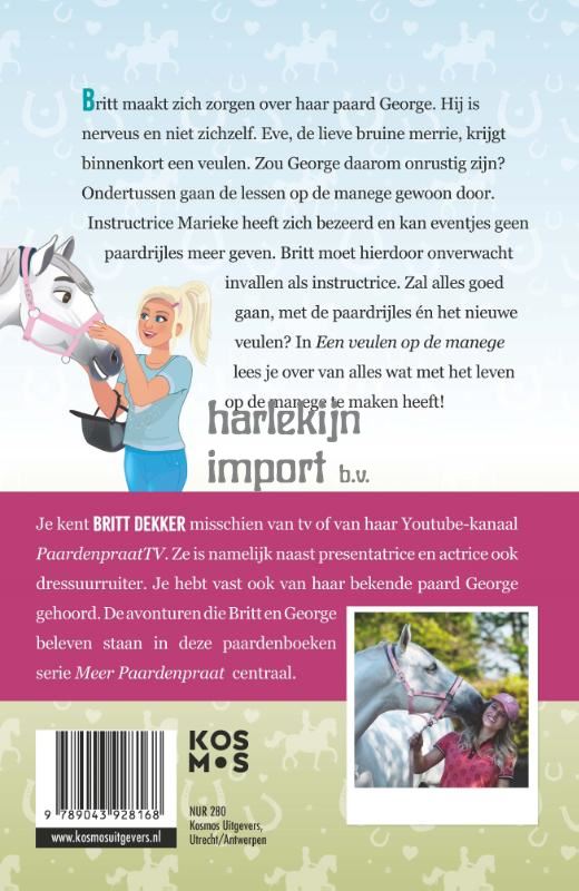 In 'Een veulen op de manege' maakt Britt zich zorgen over haar paard George. Hij is nerveus en niet zichzelf. Zou het komen omdat Eve, de lieve bruine merrie, een veulen gaat krijgen? Ondertussen gaan de lessen op de manege gewoon door en moet Britt onverwacht invallen als instructrice. Zal alles goed gaan, met de paardrijles én het veulen? Britt Dekker is dressuurruiter, presentatrice en actrice en met haar YouTube-kanaal PaardenpraatTV spreekt ze jonge paardenmeisjes aan. Haar paard George is minstens zo bekend en in deze paardenboekenserie Meer Paardenpraat staan de avonturen van Britt en George dan ook centraal.