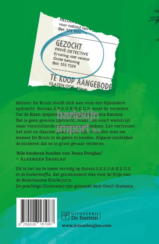 Meneer De Bruin meldt zich aan voor een bijzondere opdracht. Bureau Speurneus moet de vermiste Cor de Haan opsporen in de jungle van Costa Banana. Het is geen gewone opdracht, maar een wedstrijd waar verschillende amateurdetectives aan meedoen. Lev vertrouwt het niet en daarom gaan hij, Daiza, Hugo en Yara mee om meneer De Bruin in de gaten te houden. Al gauw ontdekken de kinderen dat ze in groot gevaar verkeren.