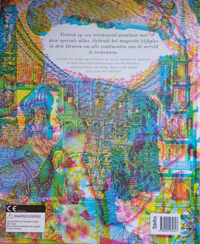 Vertrek op een verrassend avontuur met deze speciale atlas. Gebruik het magische kijkglas in drie kleuren om alle continenten van de wereld te verkennen. Planten en dieren, geschiedenis en kunst: ontdek het allemaal in deze kleurrijke kaleidoscoop van het Milanese ontwerpersduo Carnovsky. Waar in de wereld gaat jouw reis naartoe?