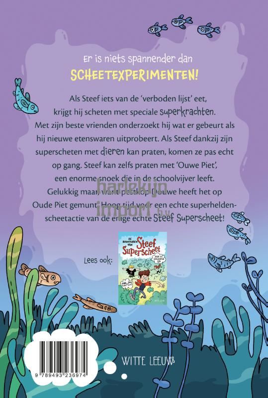 Er is niets spannender dan schetenexperimenten! Steef, Bobby en Sterre willen uitzoeken welk ‘verboden’ eten tot welke scheet leidt. Als Steef dankzij zijn superscheten met dieren kan praten, komen ze pas echt op gang. Steef kan zelfs praten met ‘Flipper’, een enorme snoek die in de schoolvijver leeft – gelukkig maar! Want pestkop Douwe heeft het op Flipper gemunt. De drie vrienden moeten zo snel mogelijk de juiste scheet vinden om ergere dingen te voorkomen… ‘Enorm grappig en hilarisch!’ – Boekeneiland‘Ik lag dubbel van het lachen!’ – Lifestyle Mommy’s