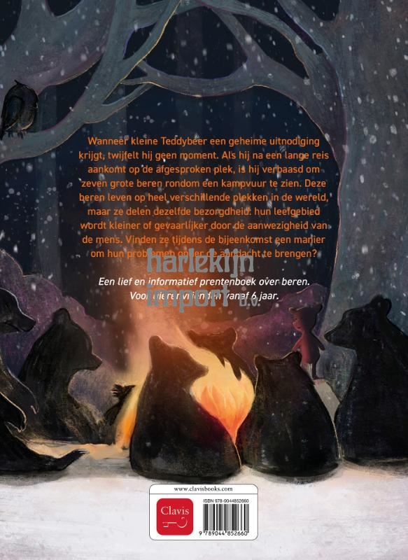 Wanneer kleine Teddybeer een geheime uitnodiging krijgt, twijfelt hij geen moment. Als hij na een lange reis aankomt op de afgesproken plek, is hij verbaasd om zeven grote beren rondom een kampvuur te zien. Deze beren leven op heel verschillende plekken in de wereld, maar ze delen dezelfde bezorgdheid: hun leefgebied wordt kleiner of gevaarlijker door de aanwezigheid van de mens. Vinden ze tijdens de bijeenkomst een manier om hun problemen onder de aandacht te brengen? Een lief en informatief prentenboek over beren. Voor dierenvrienden vanaf 6 jaar.