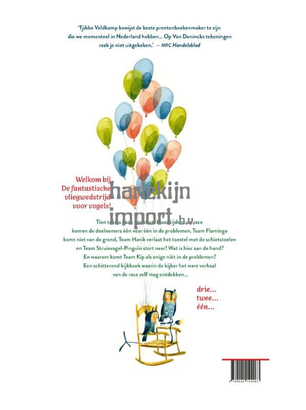 Welkom bij de Vliegwedstrijd voor Vogels! Tien teams gaan van start. Maar tijdens de race komen de deelnemers één voor één in de problemen. Team Flamingo komt niet van de grond, Team Havik verlaat het toestel met de schietstoelen en Team Struisvogel-Pinguïn stort neer! Wat is hier aan de hand? En waarom komt Team Kip als enige níét in de problemen?