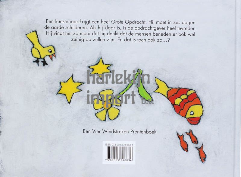 Een kunstenaar krijgt een heel Grote Opdracht. Hij moet in zes dagen de aarde schilderen. Hij schildert de dag met veel wit, en de nacht met zwart. Hij schildert de bomen en de planten, de zon, de maan en de sterren. Op dag vijf en zes schildert hij de dieren, en een klein mannetje dat voor de dieren en de planten kan zorgen.