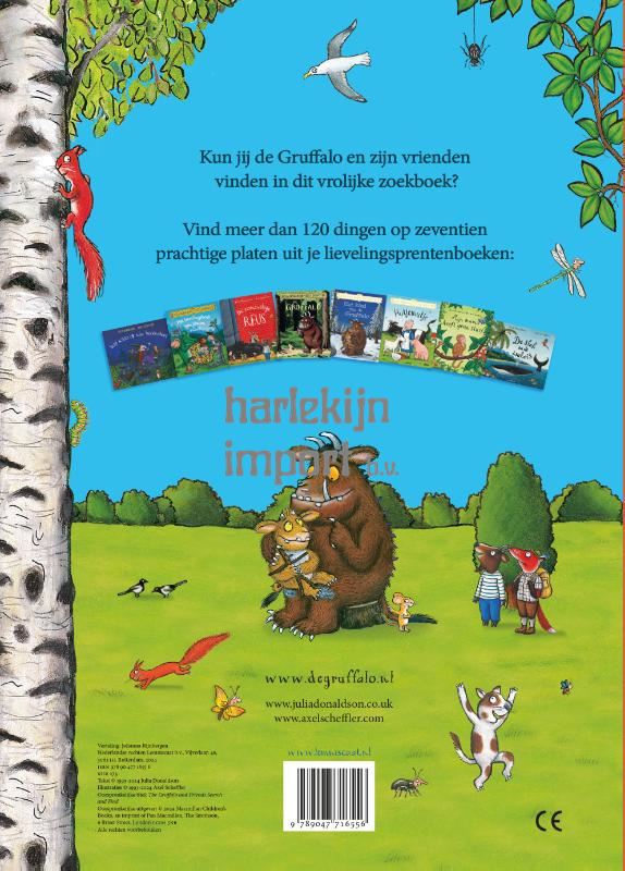 Ga met de Gruffalo en al je andere favoriete prentenboekenfiguren op zoek in dit prachtige prentenboek. Verken het Donkere Bos van de Gruffalo, maak een reuzenwandeling, ontsnap met de heks aan een hongerige draak, reis met de slak en de walvis rond de wereld en beleef nog veel meer avonturen. Het perfecte boek om urenlang mee bezig te zijn tijdens regenachtige weekends, tijdens reizen achter in de auto of gewoon omdat je er zin in hebt. Gebaseerd op de lievelingsprentenboeken De Gruffalo, Het kind van de Gruffalo, Stap maar op mijn bezemsteel, De rommelige reus, Hutjemutje, Het lievelingsboek van Simon Snoek, Mijn mama heeft geen slurf en De slak en de walvis.