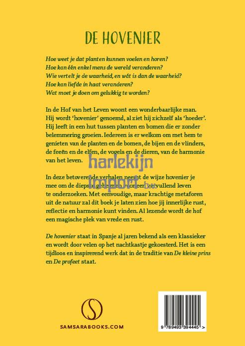Hoe weet je dat planten kunnen voelen en horen? Hoe kan één enkel mens de wereld veranderen? Wie vertelt je de waarheid, en wát is dan de waarheid? Hoe kan liefde in haat veranderen? Wat moet je doen om gelukkig te worden? In de Hof van het Leven woont een wonderbaarlijke man. Hij wordt ‘hovenier’ genoemd, al ziet hij zichzelf als ‘hoeder’. Hij leeft in een hut tussen planten en bomen die er zonder belemmering groeien. Iedereen is er welkom om met hem te genieten van de planten en de bomen, de bijen en de vlinders, de feeën en de elfen, de vogels en de dieren, van de harmonie van het leven. In deze betoverende verhalen neemt de wijze hovenier je mee om de diepste geheimen voor een vervullend leven te onderzoeken. Met eenvoudige, maar krachtige metaforen uit de natuur zal dit boek je laten zien hoe jij innerlijke rust, reflectie en harmonie kunt vinden. Al lezende wordt de hof een magische plek van vrede en rust. 'De hovenier' staat in Spanje al jaren bekend als een klassieker en wordt door velen op het nachtkastje gekoesterd. Het is een tijdloos en inspirerend werk dat in de traditie van 'De kleine prins' en 'De profeet' staat.