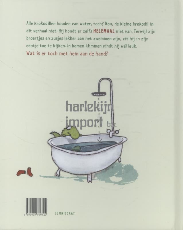 Kleine krokodil is niet zoals zijn broertjes en zusjes. Terwijl zij spartelen, sproeien en sproetsen, blijft hij liever aan de kant. Hij houdt niet van water.