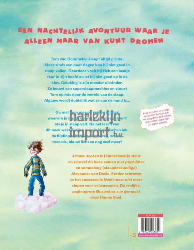 In De superslaapmachine van kinderboekenauteur Jelmer Jepsen en slaapexpert Alexander van Daele maakt een jongen een avontuurlijke reis door de wereld van de slaap. Dit unieke boek met sfeervolle illustraties van Hanne Snel is bedoeld voor kinderen die moeite hebben om in slaap te vallen of er gewoon meer over willen weten. Want wat gebeurt er eigenlijk precies als je naar dromenland afreist? Tom van Dommelen slaapt altijd prima. Maar sinds een paar dagen is er iets raars aan de hand: hij kan ineens niet meer in slaap vallen. Daardoor let hij niet goed op in de klas en heeft hij bijna nergens zin in. Gelukkig is zijn moeder uitvinder en bouwt ze een superslaapmachine. Tom belandt in een nachtelijk avontuur en ontdekt niet alleen wat er precies in je hoofd en lichaam gebeurt als je slaapt, maar ook waar je biologische klok zit en hoe je voortaan elke avond snel naar dromenland kunt afreizen… De superslaapmachine bevat naast een pakkend avontuur veel handige en grappige weetjes, tips om in slaap te vallen én tips om de dag door te komen wanneer je even niet zo goed slaapt. Samen schreven de auteurs ook Nooit meer niet meer slapen voor volwassenen.