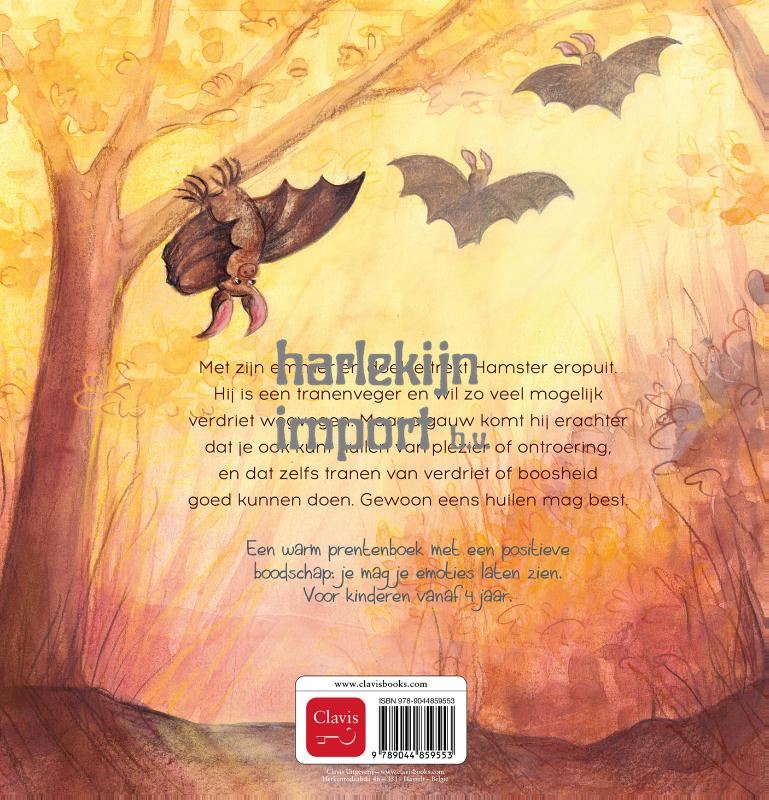 Met zijn emmer en doekje trekt Hamster eropuit. Hij is een tranenveger en wil zo veel mogelijk verdriet wegvegen. Maar algauw komt hij erachter dat je ook kunt huilen van plezier of ontroering, en dat zelfs tranen van verdriet of boosheid goed kunnen doen. Gewoon eens huilen mag best. Een warm prentenboek met een positieve boodschap: je mag je emoties laten zien. Voor kinderen vanaf 4 jaar.