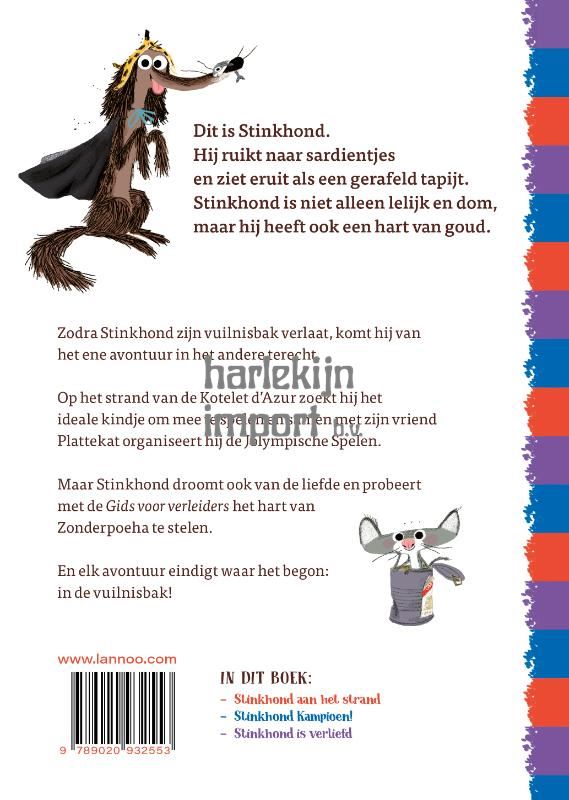 Zodra Stinkhond zijn vuilnisbak verlaat, komt hij van het ene avontuur in het andere terecht. Op het strand van de Kotelet d'Azur zoekt hij het ideale kindje om mee te spelen en samen met zijn vriend Plattekat organiseert hij de Jolympische Spelen. Maar Stinkhond droomt ook van de liefde en probeert met de Gids voor verleiders het hart van Zonderpoeha te stelen. En elk avontuur eindigt waar het begon: in de vuilnisbak! 'Je wil 'm niet in je huis, maar als personage van een boekenreeks werkt Stinkhond als een tierelier.' - Nieuwsblad.be 'De avonturen zijn niet alleen ontzettend grappig en ondeugend, ze gaan ook over een onverwoestbare vriendschap.' - Boekwijzer.com over De dikke Stinkhond