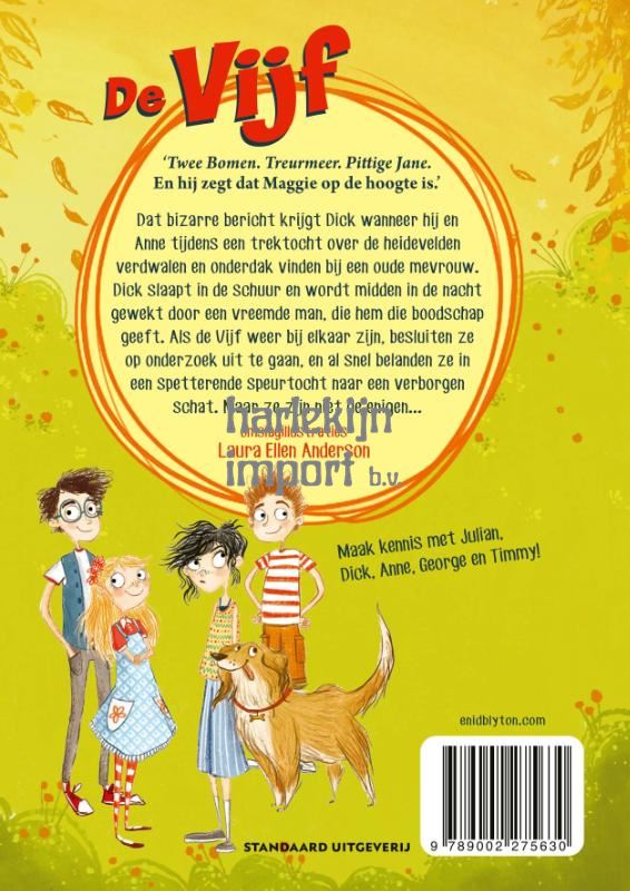 Twee Bomen. Treurmeer. Pittige Jane. En hij zegt dat Maggie op de hoogte is.’ Dat bizarre bericht krijgt Dick wanneer hij en Anne tijdens een trektocht over de heidevelden verdwalen en onderdak vinden bij een oude mevrouw. Dick slaapt in de schuur en wordt midden in de nacht gewekt door een vreemde man, die hem die boodschap geeft. Als de Vijf weer bij elkaar zijn, besluiten ze op onderzoek uit te gaan, en al snel belanden ze in een spetterende speurtocht naar een verborgen schat. Maar ze zijn niet de enigen...
