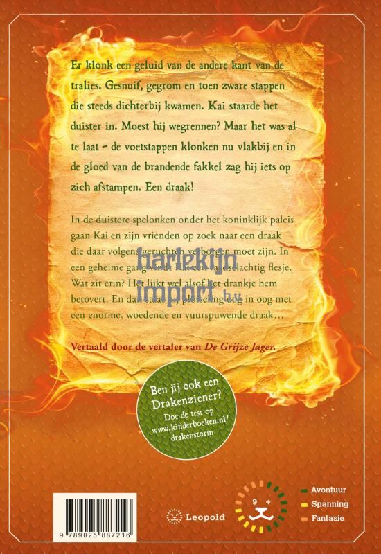 Er klonk een geluid van de andere kant van de tralies. Gesnuif, gegrom en toen zware stappen die steeds dichterbij kwamen. Kai staarde het duister in. Moest hij wegrennen? Maar het was al te laat – de voetstappen klonken nu vlakbij en in de gloed van de brandende fakkel zag hij iets op zich afstampen. Een draak! In de duistere spelonken onder het koninklijk paleis gaan Kai en zijn vrienden op zoek naar een draakdie daar volgens geruchten verborgen moet zijn. In een geheime gang vindt Kai een raadselachtig flesje. Wat zit erin? Het lijkt wel alsof het drankje hem betovert. En dan staat hij plotseling oog in oog met een enorme, woedende en vuurspuwende draak…