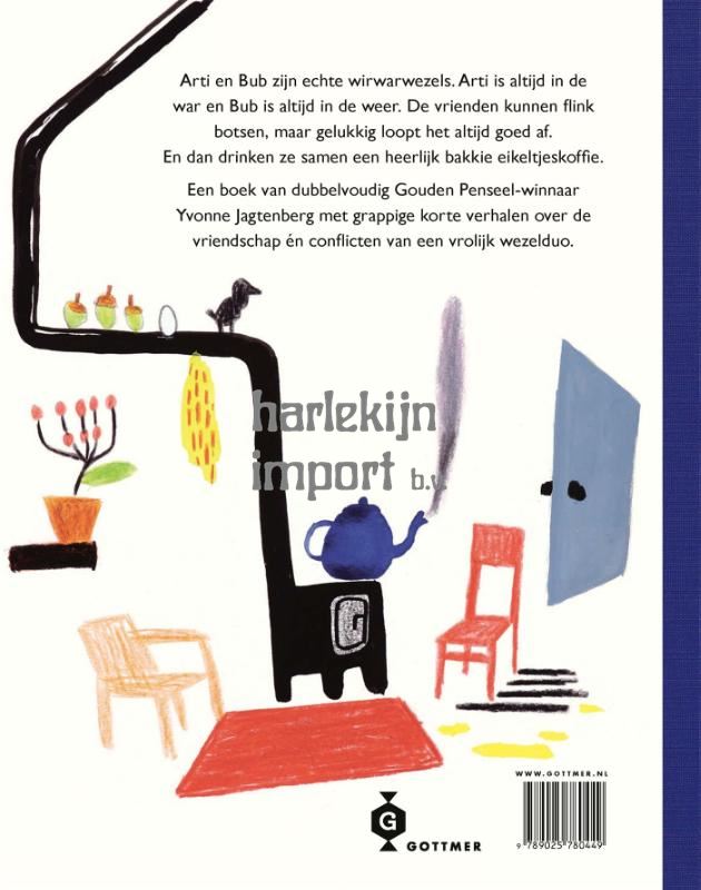 Arti en Bub zijn de wirwarwezels! Het dikke voorleesboek 'De wirwarwezels' van tweevoudig Gouden Penseel-winnares Yvonne Jagtenberg zit vol met grappige verhalen over de twee vrienden. Arti is altijd in de war en Bub is altijd in de weer. Gelukkig lopen alle avonturen meestal goed af, met een lekker bakkie troost: eikeltjeskoffie! 'De wirwarwezels' is een heerlijk eigenzinnig en droogkomisch voorleesboek - een boek zoals alleen Yvonne Jagtenberg dat kan maken. Met haar gevoel voor humor en haar rake illustraties slaagt Jagtenberg erin complexe thema's op een toegankelijke manier aan te snijden. 'De wirwarwezels' is leuk om voor te lezen aan kinderen vanaf 3 jaar. Lees ook Yvonne Jagtenbergs prentenboeken 'Ik ben Pippi niet! ' (Bronzen Penseel), 'Hup Herman! ' (Gouden Penseel) en 'Kop op, Herman! ' of de serie kartonboekjes over Klein Geitje voor de allerkleinsten.
