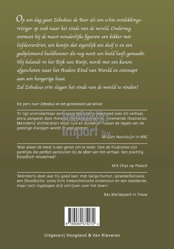 Op een dag gaat Zebedeus de Beer als een echte ontdekkingsreiziger op zoek naar het einde van de wereld. Onderweg ontmoet hij de meest wonderlijke figuren: een kikker met liefdesverdriet, een konijn dat eigenlijk een duif is en een gediplomeerd beeldhouwer die nog nooit een beeld heeft gemaakt. Hij belandt in het Rijk van Kwijt, wordt met een kanon afgeschoten naar het Andere Eind van Wereld en ontsnapt aan een hongerige haai. Zal Zebedeus erin slagen het einde van de wereld te vinden?