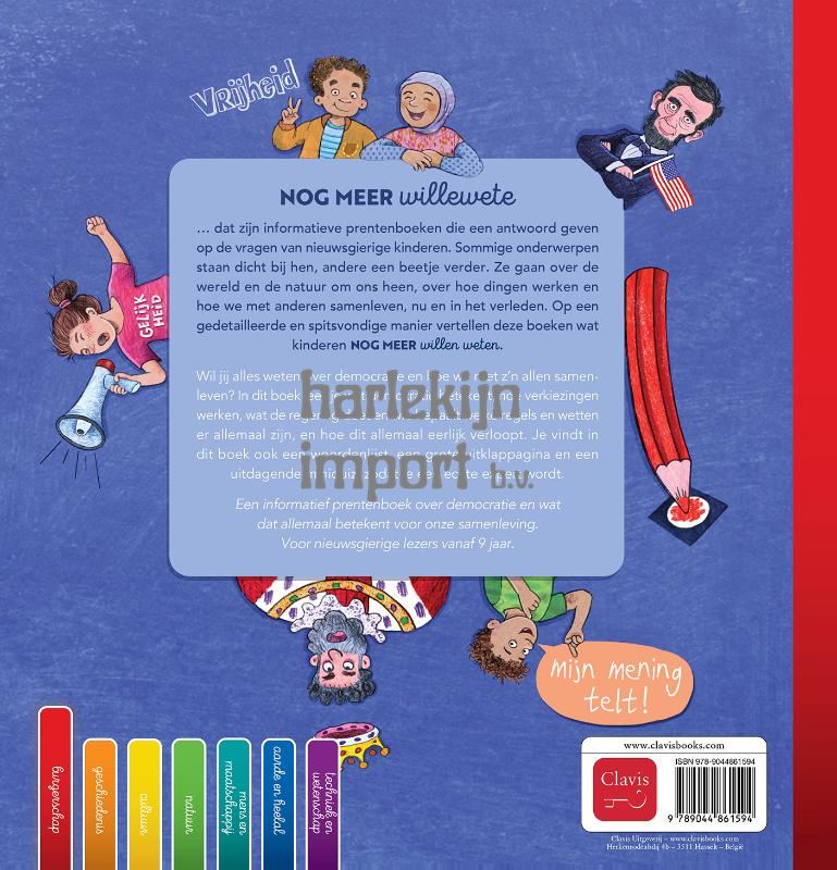 NogmeerWillewete … dat zijn informatieve prentenboeken die een antwoord geven op de vragen van nieuwsgierige kinderen. Sommige onderwerpen staan dicht bij hen, andere een beetje verder. Ze gaan over de wereld en de natuur om ons heen, over het leven in het verleden en het leven nu. Op een gedetailleerde en spitsvondige manier vertellen deze boeken wat kinderen nog meer willen weten. Wil jij alles weten over democratie en hoe we met z’n allen samenleven? In dit boek lees je wat democratie betekent, hoe verkiezingen werken, wat de regering doet en wie bepaalt welke regels en wetten er allemaal zijn, en hoe dit allemaal eerlijk verloopt. Je vindt in dit boek ook een grote uitklappagina en een uitdagende miniquiz, zodat je een echte expert wordt. Een informatief prentenboek over democratie en wat dat allemaal betekent voor onze samenleving. Voor nieuwsgierige lezers vanaf 9 jaar.