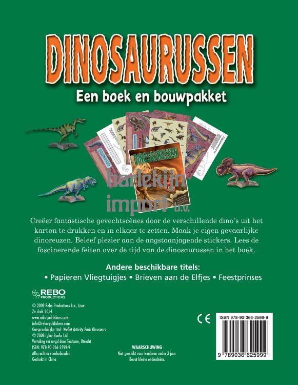 Creëer fantastische gevechtscènes door de verschillende dino's uit het karton te drukken en in elkaar te zetten. Maak je eigen gevaarlijke dinoreuzen. Beleef plezier aan de angstaanjagende stickers. Lees de fascinerende feiten over de tijd van de dinosaurussen in het boek.