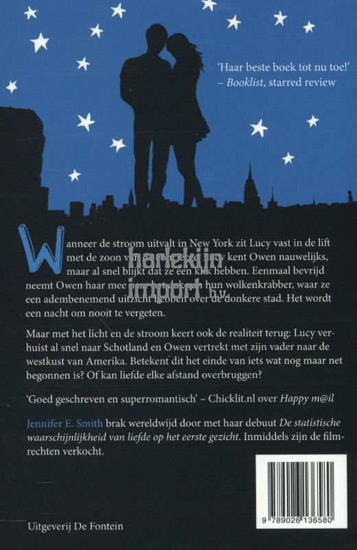 Duizend kilometer tussen jou en mij is het heerlijke, onweerstaanbare verhaal van Lucy en Owen die elkaar in een lift ontmoeten en op slag verliefd worden. Schrijfster Jennifer E. Smith, bekend van de bestseller De statistische waarschijnlijkheid van liefde op het eerste gezicht, heeft opnieuw een prachtige jeugdroman geschreven.