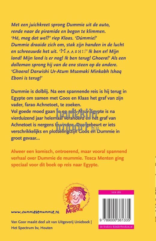 <h1>Het tweede avontuur van Dummie de mummie!</h1> <p><em>Met een juichkreet sprong Dummie uit de auto, rende naar de piramide en begon te klimmen.</em><br /><em>'Hé, mag dat wel?' riep Klaas. 'Dúmmie!'</em><br /><em>Dummie draaide zich om, stak zijn handen in de lucht en schreeuwde het uit. 'Maashi! Ik ben er! Mijn land! Mijn land is er nog! Ik ben terug! Ghoera!' Als een dolleman sprong hij van de ene steen op de andere. 'Ghoera! Darwishi Ur-Atum Msamaki Minkabh Ishaq Eboni is terug!'</em></p> <p>Dummie is dolblij. Na een spannende reis is hij terug in Egypte om samen met Goos en Klaas het graf van zijn vader, farao Achnetoet, te zoeken. Vol goede moed gaan ze op pad. Maar Egypte is na vierduizend jaar helemaal veranderd en het graf van Achnetoet is nergens te vinden. Dan gebeurt er iets verschrikkelijks en plotseling zijn Goos en Dummie in groot gevaar...</p> De Dummie de mummie-serie bestaat uit: Deel 0: Een jonge prins in het oude Egypte Deel 1: Dummie de mummie en de gouden scarabee Deel 2: Dummie de mummie en de tombe van Achnetoet Deel 3: Dummie de mummie en de sfinx van Shakaba Deel 4: Dummie de mummie en het masker van Sebek-Ra Deel 5: Dummie de mummie en de dans van de cobra Deel 6: Dummie de mummie en de ster Thoeban Deel 7: Dummie de mummie en de drums van Massoeba Deel 8: Dummie de mummie en de smaragd van de Nijl Deel 9: Dummie de mummie en het geheim van Toemsa Deel 10: Dummie de mummie en de schat van Sohorro