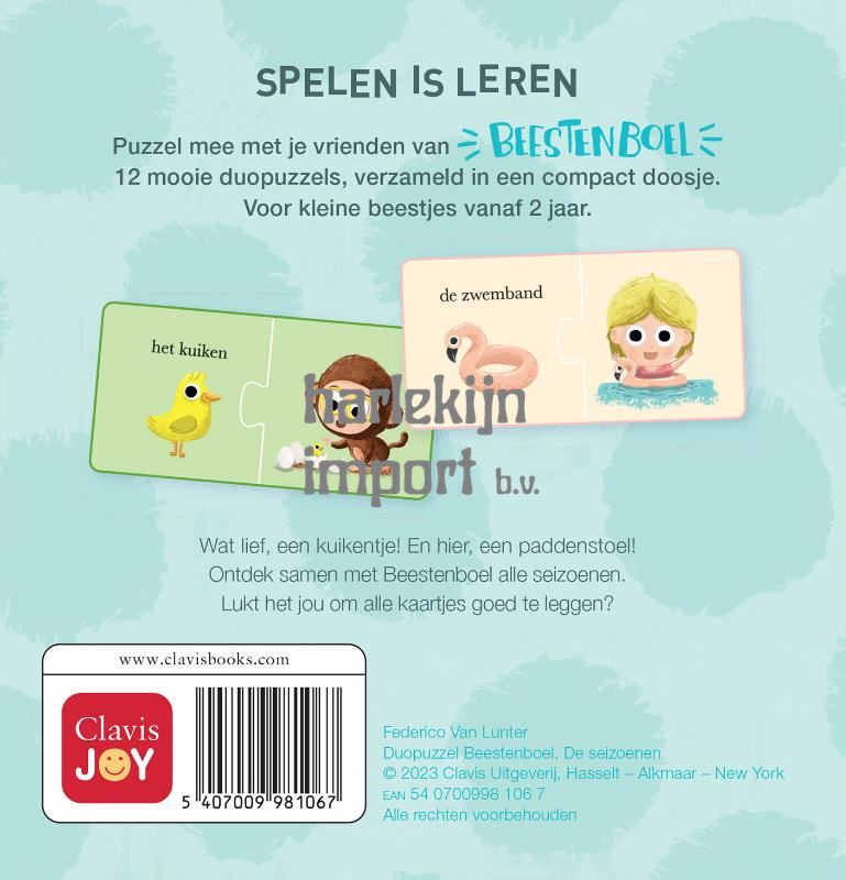 Puzzel mee met je vrienden van Beestenboel. 12 mooie duopuzzels, verzameld in een compact doosje. Voor kleine beestjes vanaf 2 jaar. Wat lief, een kuikentje! En hier, een paddenstoel! Ontdek samen met Beestenboel alle seizoenen. Lukt het jou om alle kaartjes goed te leggen? Spelen en leren met je lievelingspersonages Voor jonge kinderen is het leven één grote ontdekkingstocht. Gelukkig nemen de personages uit hun favoriete boeken hen met veel enthousiasme mee in herkenbare, ontroerende en spannende avonturen. Met Clavis Joy komen de geliefde personages nog meer tot leven, helemaal klaar om samen met je kind te spelen en te ontdekken.