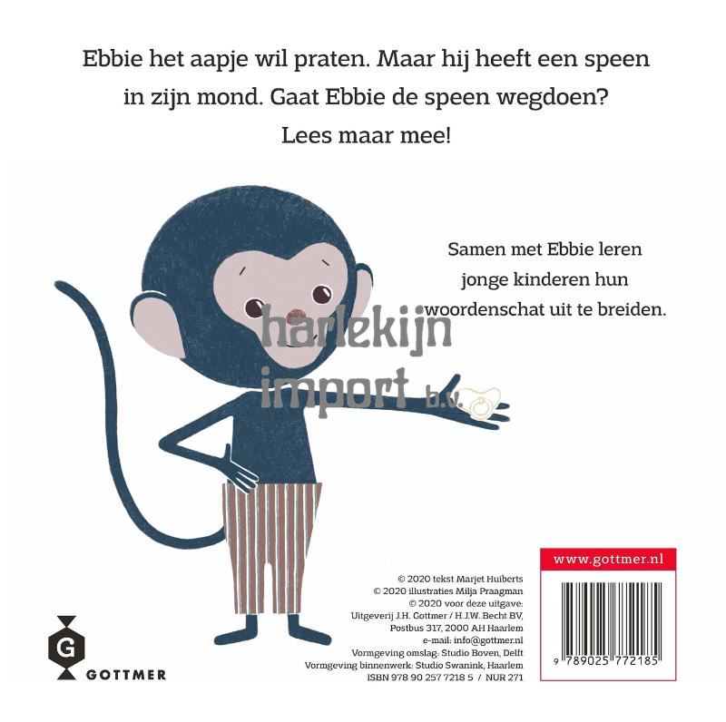 Deel 2 in de populaire Ebbie-serie. Het koddige aapje Ebbie is terug! In dit tweede deel moeten peuters Ebbie helpen om van zijn speen af te komen. Zou het lukken? Vast wel! En ondertussen worden er gelijk wat belangrijke nieuwe woordjes geleerd. De vrolijke illustraties van Milja Praagman in 'Ebbie zonder speen' helpen peuters afscheid te nemen van de speen.