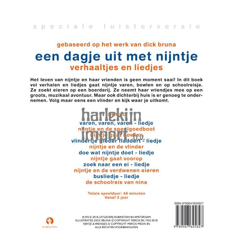 Het leven van nijntje en haar vrienden is geen moment saai! In dit boek vol verhalen en liedjes gaat nijntje varen, bowlen en op schoolreisje. Ze zoekt eieren op een boerderij. Ze neemt haar vriendjes mee op een groots, muzikaal avontuur. Maar ook dichterbij huis is er genoeg te ondernemen. Volg maar eens een vlinder en kijk waar je uitkomt! Zing mee met de liedjes en volg nijntje en haar vriendjes in het boek! Met nijntje en de speelgoedboot, nijntje gaat bowlen, nijntje en de vlinder, nijntje gaat voorop, nijntje en de verdwenen eieren en de schoolreis van nina