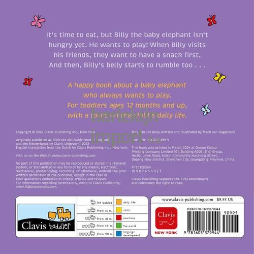 It’s time to eat, but Billy the baby elephant isn’t hungry yet. He wants to play! When Billy visits his friends, they want to have a snack first. And then, Billy’s belly starts to rumble too . . . A happy book about a baby elephant who always wants to play. For toddlers ages 12 months and up, with a focus on the child’s daily life.
