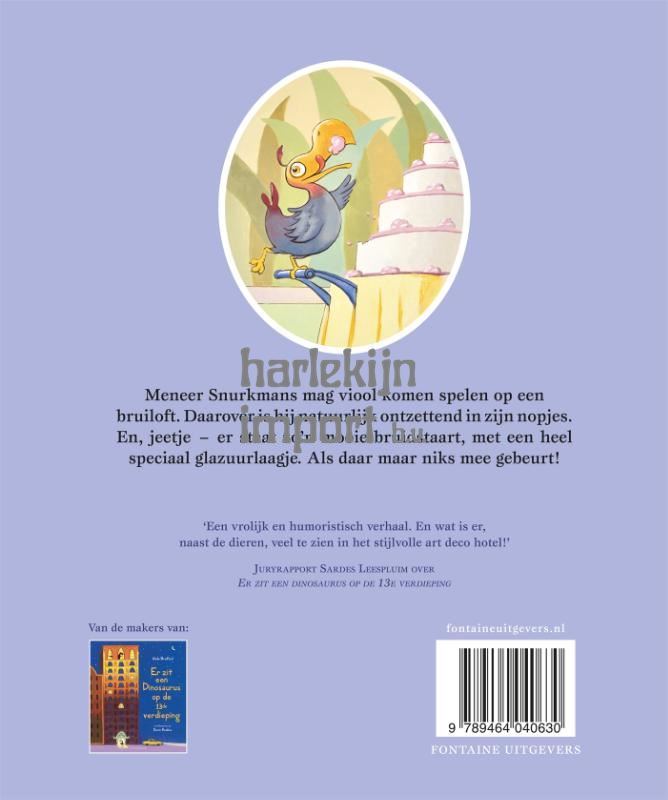 Meneer Snurkmans mag viool komen spelen op een bruiloft. Dus is hij natuurlijk ontzettend in zijn nopjes. En, jeetje - er staat zo'n mooie bruidstaart met een heel speciaal glazuurlaagje. Als daar maar niks mee gebeurt! Meneer Snurkmans stelt alles in het werk om de taart te beschermen voordat de bruiloft begint. Vleermuizen, struisvogels en dino's - iedereen jaagt hij weg van de taart. Maar is dat wel zo verstandig of begaat meneer Snurkmans hier een oliedomme fout?