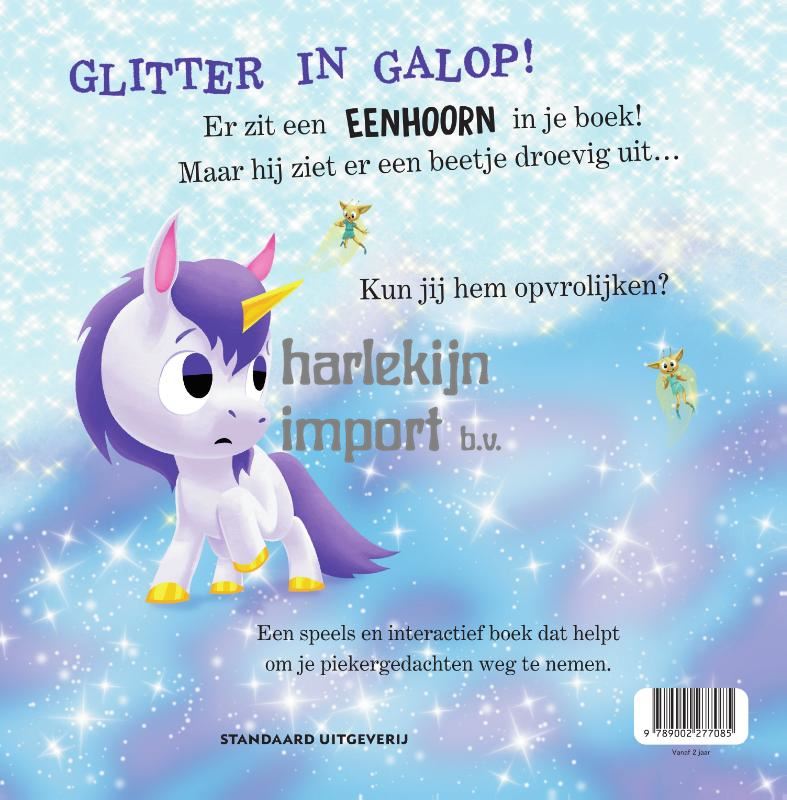 Glitter in galop! Er zit een eenhoorn in je boek! Maar hij ziet er een beetje droevig uit... Kun jij hem opvrolijken? Een speels en interactief boek dat helpt om je piekergedachten weg te nemen.