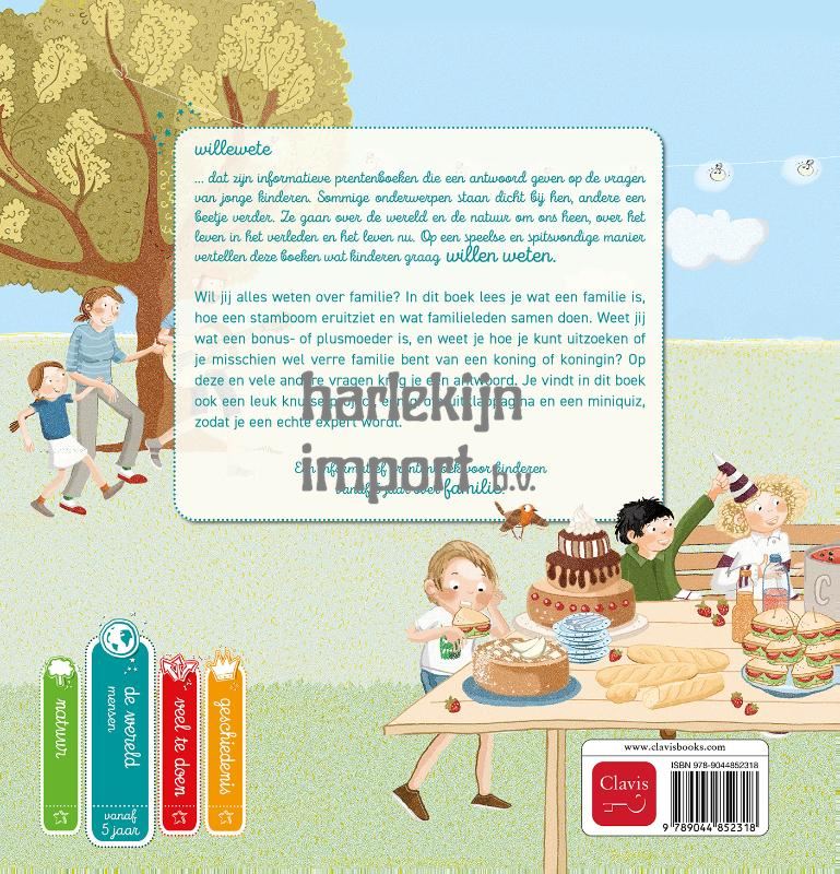Wil jij alles weten over familie? In dit boek lees je wat een familie is, hoe een stamboom eruitziet en wat familieleden samen doen. Weet jij wat een bonus- of plusmoeder is, en weet je hoe je kunt uitzoeken of je misschien wel verre familie bent van een koning of koningin? Op deze en vele andere vragen krijg je een antwoord. Je vindt in dit boek ook een leuk knutselproject, een grote uitklappagina en een miniquiz, zodat je een echte expert wordt. Een informatief prentenboek over familie. Voor nieuwsgierige kinderen vanaf 5 jaar.