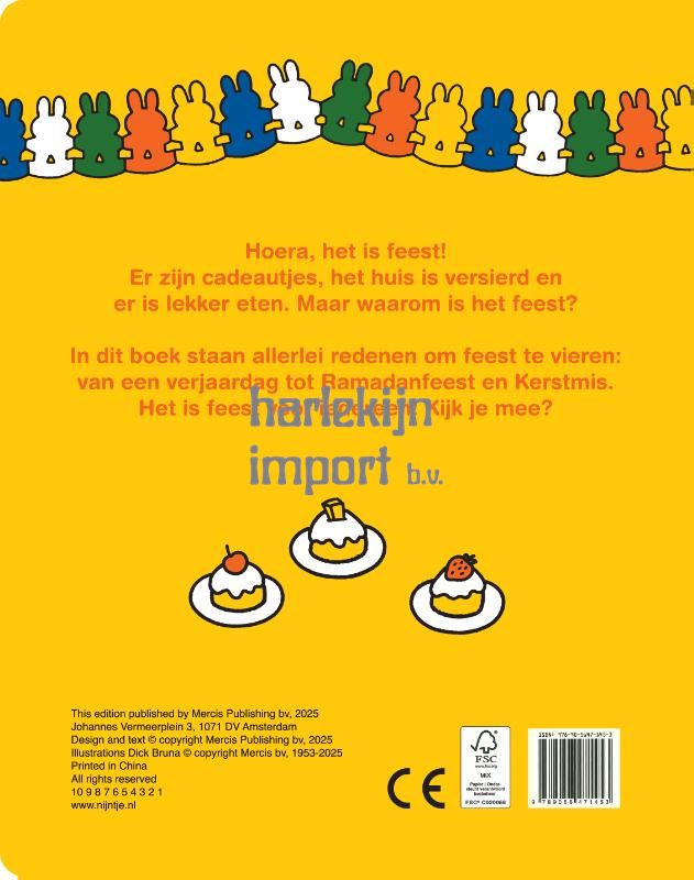 Hoera, het is feest! Er zijn cadeautjes, het huis is versierd en er is lekker eten. Maar waarom is het feest? In dit boek staan allerlei redenen om feest te vieren: van een verjaardag tot het Ramadanfeest en Kerstmis. Kijk je mee? Vanwege 70 jaar nijntje heeft dit boek een extra feestelijke uitvoering met embossing op het voorplat. Het is feest voor iedereen!