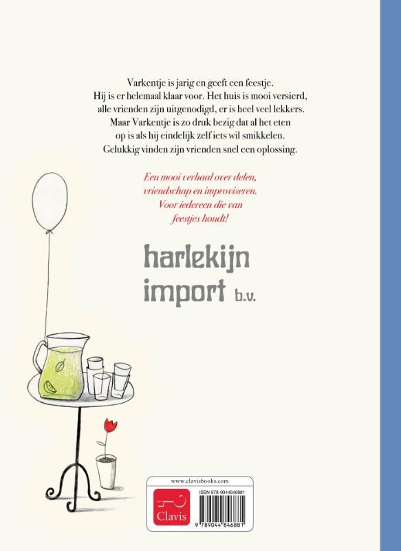 Varkentje is jarig en geeft een feestje. Hij is er helemaal klaar voor. Het huis is mooi versierd, alle vrienden zijn uitgenodigd, er is heel veel lekkers. Maar Varkentje is zo druk bezig dat al het eten op is als hij eindelijk zelf iets wil smikkelen. Gelukkig vinden zijn vrienden snel een oplossing. Een mooi verhaal over delen, vriendschap en improviseren. Voor iedereen die van feestjes houdt!