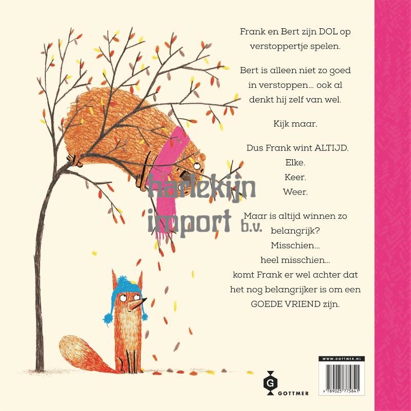 ''Frank en Bert' is een hartverwarmend - maar vooral grappig - prentenboek over de vrienden Bert de beer en Frank de vos. De slimme Frank spreekt de lezer op licht betweterige toon aan en vertelt ze liefdevol over zijn allerbeste maar beetje domme vriend Bert. Elke dag spelen de twee verstoppertje. Frank is er erg goed in, Bert... minder. De grote beer verstopt zich altijd wel achter een dun boompje of in een te kleine grot. Bert wil dolgraag winnen met verstoppertje spelen, maar het lukt hem nooit. Dus laat Frank, zoals het een goede vriend betaamt, Bert een keer winnen. Hij doet net alsof hij hem niet kan vinden. Nu Bert gewonnen heeft, mag hij Frank gaan zoeken. En die zal wel eens voordoen hoe je je echt goed moet verstoppen. Maar dan blijkt dat Bert zich misschien toch niet zo makkelijk laten foppen door zijn slimme vriend...