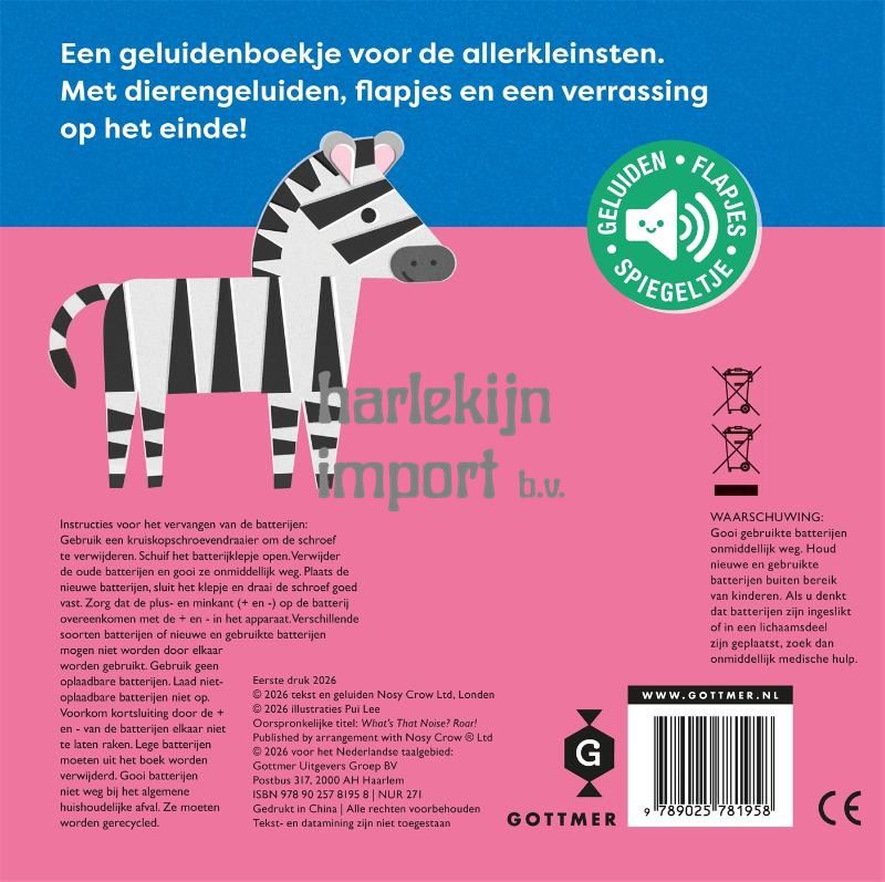 Het leukste geluidenboekje over wilde dieren voor kindjes vanaf 1 jaar! 'Wat hoor ik daar? - Brul!' is een innovatief en interactief flapjesboek dat perfect is voor nieuwsgierige dreumesen. In dit kartonboekje met het thema wilde dieren hoor je vijf verschillende dierengeluiden. Luister samen naar het geluid, raad welk dier zich verstopt en til het flapje op om te zien welk wild dier het is! Was het een zebra, een olifant, een nijlpaard of een leeuw? Als verrassing aan het einde: een geluidje en een spiegel waarin je kindje zichzelf kan zien! Pui Lee is een freelance illustrator en grafisch ontwerper uit Londen. Met een speelse en grafische benadering maakt ze gebruik van eenvoudige vormen, structuren en kleuren. Ze illustreert graag alledaagse objecten en experimenteert met texturen en patronen om een verhaal te vertellen. 'Wat hoor ik daar? - Brul!' is zonder twijfel het leukste dierenboekje met geluiden om spelenderwijs kennis te maken met wilde dieren. Geschikt voor kindjes vanaf 12 maanden. Ook verkrijgbaar in de serie Wat hoor ik daar? zijn: 'Wat hoor ik daar? - Miauw!', 'Wat hoor ik daar? - Boe!' en 'Wat hoor ik daar? - Tjiep!'