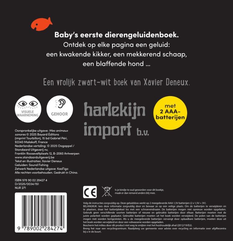 Baby's eerste dierengeluidenboek.Ontdek op elke pagina een geluid:een kwakende kikker, een mekkerend schaap, een blaffende hond … Een vrolijk zwart-wit boek van Xavier Deneux.